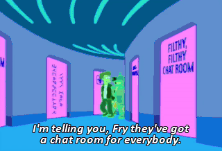 I'm telling you, Fry they've got a chat room for everybody. And here it is. Eww. That is so gross. Yeah. I'll stick with this one, thank you. Yeah.