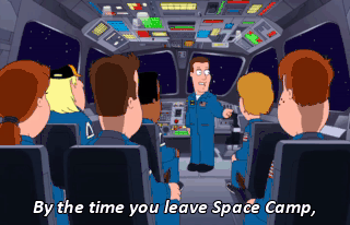 By the time you leave Space Camp, you will all be familiar with every device on board this craft. What's this button do? Why don't you go ahead and push it? (ROCK MUSIC PLAYING) That's my band.