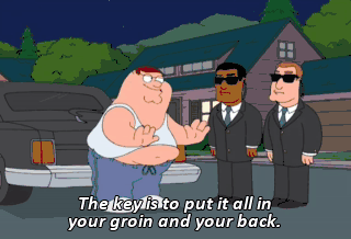 The key is to put it all in your groin and your back. Take your legs totally out of the equation. Lift with your lower back in a jerking, twisting motion. (CRACKING) Peter! Oh, my God!