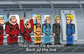 That wasn't a question. Back of the line. Okay, let's do this. JOE: Hey. Whoa, is that Harrison Ford? Yeah. It said in the brochure that he assists with all the jumps.