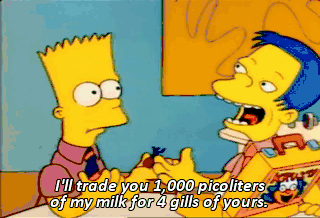 I'll trade you 1,000 picoliters of my milk for 4 gills of yours.