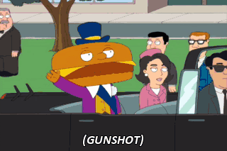 (GUNSHOT) (SPECTATORS SCREAMING) That joke's not in bad taste, right? Oh, who cares? He's a cheeseburger.