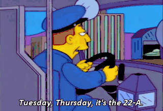Tuesday, Thursday, it's the 22-A. 22-A? Then where the heck am I? Don't make me tap the sign. But I'm lost and I need to know where-- Last stop. End of the line.