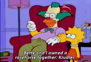 Bette and I owned a racehorse together: Krudler. Hey, Bart, if we get all these big stars to appear on a special with Krusty, it might get his career going again.