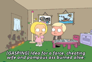 (GASPING) Idea for a farce, cheating wife and pompous ass burned alive. (LAUGHING)