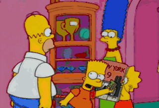 Great! We're all going to New York! Lousy Bart and his money. All right, New York, I'm comin' back! But you're not gettin' this! Dad, our baby pictures were in there. Don't you start!