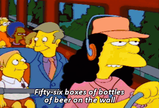 Fifty-six boxes of bottles of beer on the wall Fifty-six boxes of bottles of beer You take one down and pass it around Fifty-five boxes of bottles of beer on the wall