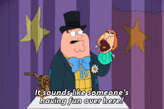 (HIGH-PITCHED VOICE) You can stop having fun!