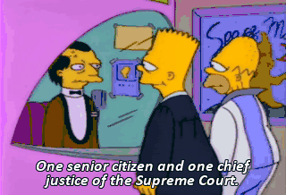 One senior citizen and one chief justice of the Supreme Court. Eh, eh, eh. I'll get it, son. That'll be $650. D'oh. One Soylent Green, hold the butter. Mmm. Soylent Green.