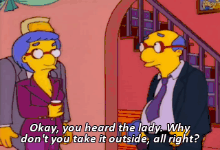 Okay, you heard the lady. Why don't you take it outside, all right?