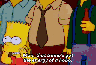 Man, that tramp's got the energy of a hobo. Yeah, he never stops punching, except to check out his bindle. He's not fallin' down at all.