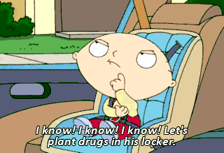 I know! I know! I know! Let's plant drugs in his locker. Oh, my God! That's a great idea. Yeah, thought you'd like that. Hey, look at that Yosemite Sam mud flap.