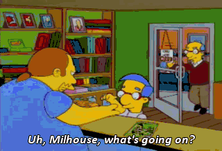 Uh, Milhouse, what's going on? You said you just needed to use the bathroom. Now I find you buying comics. Oh, our transaction is completed. You may take the boy. Wait!