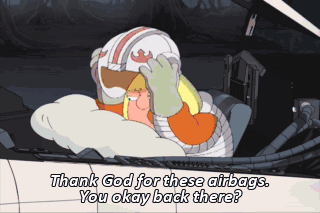 Thank God for these airbags. You okay back there? I'm okay, but the midget inside me's got a head concussion. No, no, no, no, no, no! Artoo?