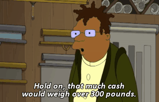 Hold on, that much cash would weigh over 300 pounds. How can Zoidberg walk out with that much weight?