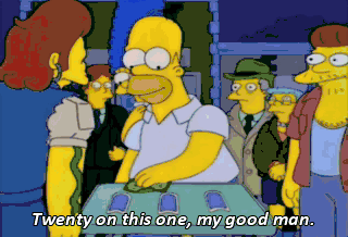 Twenty on this one, my good man. Sorry, dude. Black. Homer, he cheated you. Surely you don't blame me.
