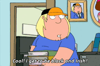 Cool! I get to be black and Irish! Yeah, and now I can wear clothes that actually show off my big butt! Oh, I gotta tell Bonnie I'm sleeping with a black man!
