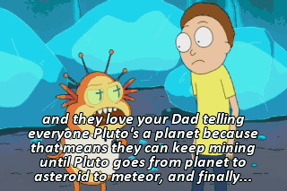 and they love your Dad telling everyone Pluto's a planet because that means they can keep mining until Pluto goes from planet to asteroid to meteor, and finally...