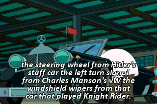 the steering wheel from Hitler's staff car the left turn signal from Charles Manson's vW the windshield wipers from that car that played Knight Rider.