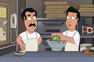 No, let's put it in a lasagna tray. Okay, great. I'll take it. Oh, and make sure to stick it right on top of the pizzas so it stays nice and warm. (PHONE RINGING) Hello. Every pizza place.
