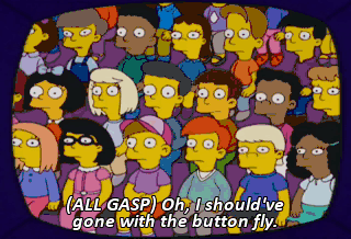 (ALL GASP) Oh, I should've gone with the button fly. (SOBBING)