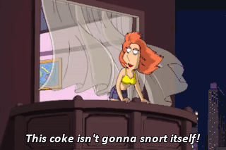 This coke isn't gonna snort itself! (ELECTRONIC POP MUSIC PLAYING) Great party, Raoul. I feel like I'm horking all your cocaine. Hey, that's okay, Lois. You can just buy the next bag, eh?