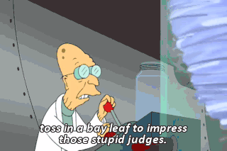 toss in a bay leaf to impress those stupid judges. Hey, where's Amy and Bender? They're missing out on some hot pickle action. (AMY AND BENDER MOANING) Sounds like a muskrat's caught in there.