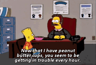 Now that I have peanut butter cups, you seem to be getting in trouble every hour.