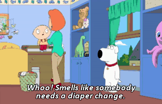 Whoo! Smells like somebody needs a diaper change. Damn right I do! Now, get this turd-filled sack off... Oh, my God, it just went back in my body.