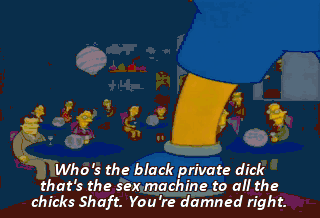 Who's the black private dick that's the sex machine to all the chicks Shaft. You're damned right. Who's the cat that won't cop out When there's danger all about Shaft Right on.