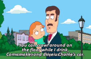 Come on, honey. Hop in Daddy's car. You can crawl around on the floor while I drink, smoke, and drive us home. (GAGGING) (CRACKLING) (CRACKLING) (GAGGING) Oh, my God, Stewie, what happened?