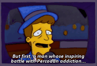 But first, a man whose inspiring battle with Percodan addiction... is soon to be a movie of the week-- Krusty the Clown! I'll be played by jimmy Smits. Now he faces his toughest audience--