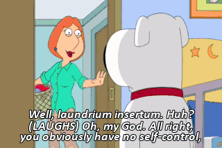 Well, laundrium insertum. Huh? (LAUGHS) Oh, my God. All right, you obviously have no self-control, so we've got to go back and do this again.