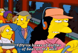 Fifty-six boxes of bottles of beer on the wall Fifty-six boxes of bottles of beer You take one down and pass it around Fifty-five boxes of bottles of beer on the wall