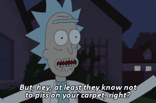 But, hey, at least they know not to piss on your carpet, right? Wait a minute. l have an idea. Gentlemen, a moment of your time. See that? I'm peeing all over your special guns. That means I own them.