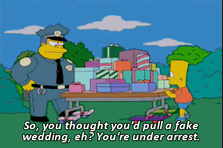 So, you thought you'd pull a fake wedding, eh? You're under arrest. Come on, Chief. It was just a prank. Would some flatware make things right? Um, what does it say on my badge? (READING) Let's go.