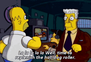 La la la la la Well, time to replenish the hot-dog roller. La la Oops! Oh, no. It is encrusted with filth. Oh, well. Let's sell it anyway.