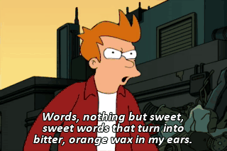 Words, nothing but sweet, sweet words that turn into bitter, orange wax in my ears. Enough with the feelings, you two.