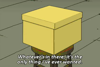 Whatever's in there, it's the only thing I've ever wanted. In my experience, boxes are usually empty. Or maybe with a little cheese stuck to the top. And one time, pepperoni! What a day that was!