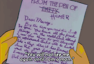 "You will not see me again until I am a man." Oh, Homer... Homer! We're all in shock. I thought he'd tWo-time you for a while first.