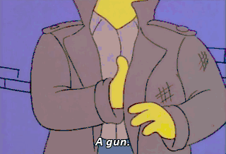 A gun. And it's been recently fired. Wait. I remember leaving the town meeting. I must have run into Mr. Burns outside and-- Hey! Mr. Burns. What have I done?