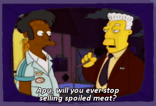 Apu, will you ever stop selling spoiled meat? No. I mean, yes. I mean-- Uh-oh. I think I come off very well.
