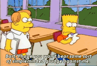 Bart, I hope you won't bear some sort of simpleminded grudge against me. I was merely trying to fend off the desecration of the school building. - Eat my shorts. - Pardon ?