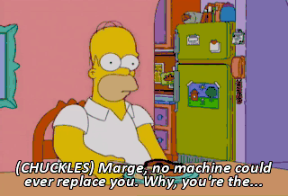 (CHUCKLES) Marge, no machine could ever replace you. Why, you're the... Or could it? Oh, Margebot, I'm ready for some loving. (SCREAMING)
