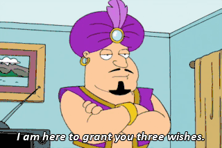 I am here to grant you three wishes. Peter, three wishes! This is so exciting! " want a new hat! " want a new hat!