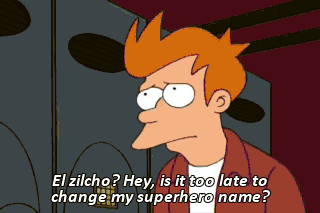 El zilcho? Hey, is it too late to change my superhero name? just be cool. Nobody knows we're "superpowerly" challenged. Man, this costume is so damn heavy. Hey, Captain Yesterday! Can I, like, wail on you...