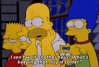 I can't wait another hour! What's keeping that stupid comet? There it is. Well, howdilly-doodilly, neighbors. Shouldn't you be in your shelterinis by now? We haven't got shelterinis. We want in yours.