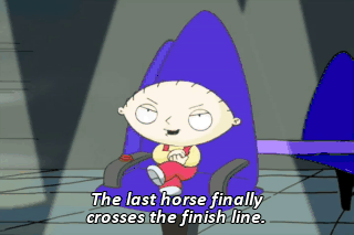 The last horse finally crosses the finish line.