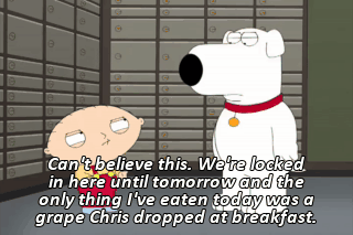 Can't believe this. We're locked in here until tomorrow and the only thing I've eaten today was a grape Chris dropped at breakfast.