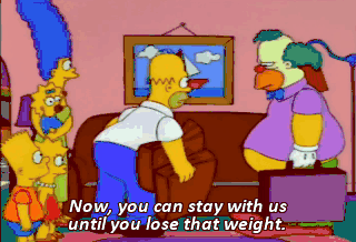 Uh-oh. Now, you can stay with us until you lose that weight. You can sleep on the sofa. It folds right out. Oh, wait. That was the old sofa.